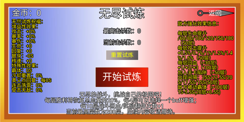 无尽的战斗,挑战自己的极限吧!每层胜利将恢复总量的20%,每4层可以选择一个buff增强;每10层战斗回血/奖励翻倍次数+1,当前最高层数为200层。