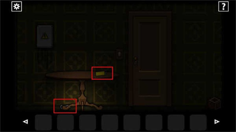 游戏开始时,发现房间很黑,无法开启墙上的开关,只能利用手电筒来照明。在左上角发现了配电盒,但里面的黑色液体流出,看起来已经坏掉了。想要打开它,但没有工具。桌子上找到一个打火机,桌子下能捡到一把钥匙。