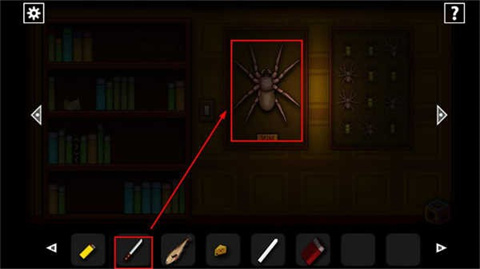 4、点卡冰箱下一层就会发现这里有着巨大无比的血印记,接着向右走,一直来到有局打蜘蛛标本的房间当中,点击书架第三层中间的书可以进行查阅,在上面可以得到密码提示。