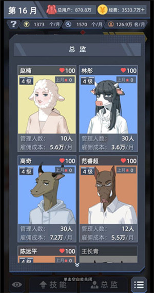 4、游戏里玩家要扮演一家互联网公司的经理,带领你手下的员工们,努力工作带来更多收益。