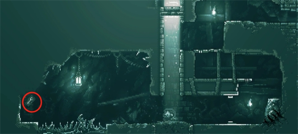 4、继续向右前进,砍断挡路的藤蔓后进入城堡区域,前往右下方的火盆处。