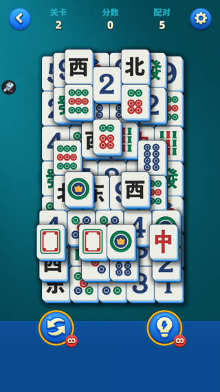 3.玩家需要在堆叠的麻将牌中,寻找能够配对的牌组进行消除。
