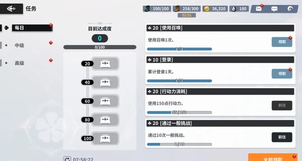最后,想必你们在第1天完成了很多「任务」呢。「任务」分为「每日任务」、「中级任务」、「高级任务」。记得及时领取丰厚奖励哦~!