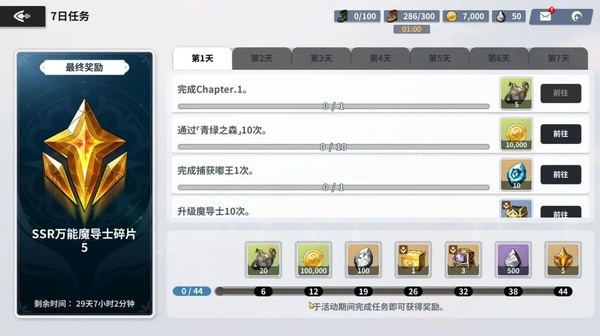 在「7日任务」里面给你们安排了超级丰厚的奖励,有黑水晶以及抽卡资源!达成最终目标,还可以获得5个「SSR万能碎片」!