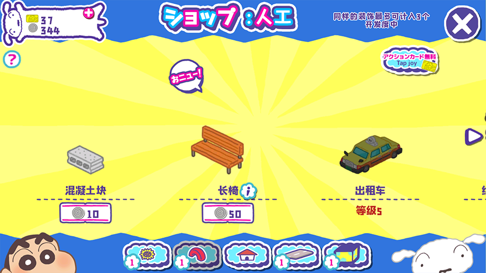 蜡笔小新春日部市大开发中文版是一款以经典动漫IP蜡笔小新为主题的模拟经营游戏。在游戏中,玩家将带领蜡笔小新和他的朋友们一起打造一个充满欢声笑语和温馨氛围的城市。游戏操作简单,不断建设住宅区、商业区、公园和各类公共设施,逐步发展春日部市,让它从一个小镇成长为繁荣的城市。