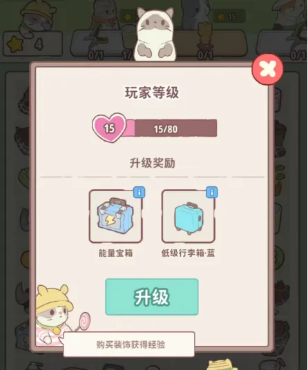 当经验值攒够,点击左上角的爱心即可升级!随着等级提升,能量宝箱、行李箱等珍稀道具等你来拿