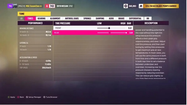 最后一步,只需要将车辆后轮的胎压升至最高即可,这样一台基础的漂移车就已经搞定了!