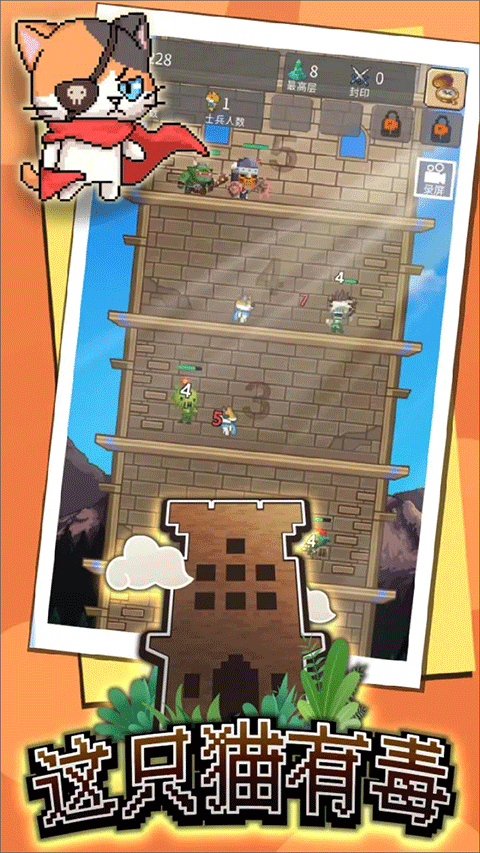 这只猫有毒内置菜单是一款充满挑战的像素风格爬塔游戏。游戏操作简单,玩家通过点击不同楼层召唤勇士,带领他们与怪物战斗。不断解锁更强的勇士和装备,海量关卡等你来挑战。游戏界面简洁,非常解压,适合所有年龄段玩家,随时随地畅玩,乐趣满满。