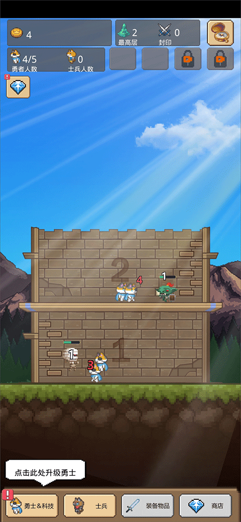 1、进入游戏后,玩家点击楼层即可召唤出勇者和士兵去打倒妖怪