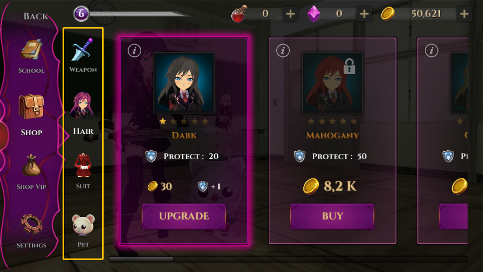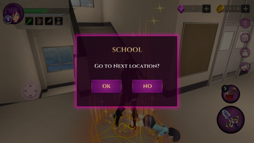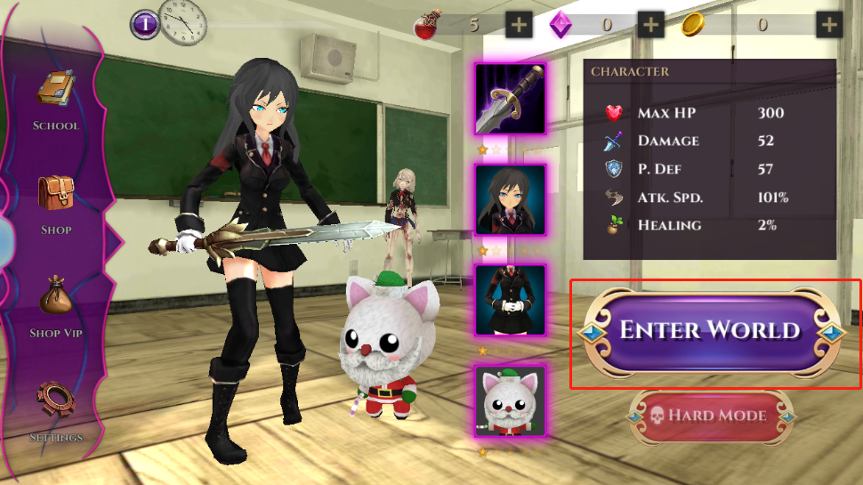 1、玩家在本站下载并安装好游戏之后,打开进入,点击右下角的紫色按钮进入世界,或者直接点击左上角的【school】进入也是一样的;下方还有一个困难模式(红色按钮),玩家也可以进行尝试;