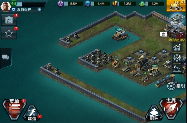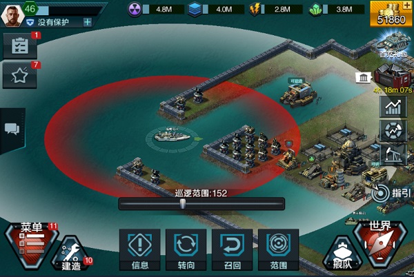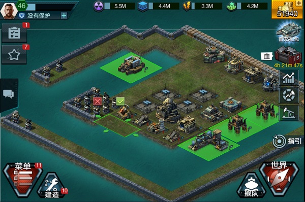 我们可以利用地形编辑,将重要的建筑仓库、大本营等放置在敌舰无法攻击到的位置,并利用地形将基地做成一个塔防形式的城防,预留给敌方单一的路线或路口。
