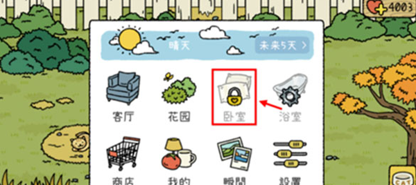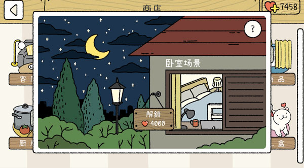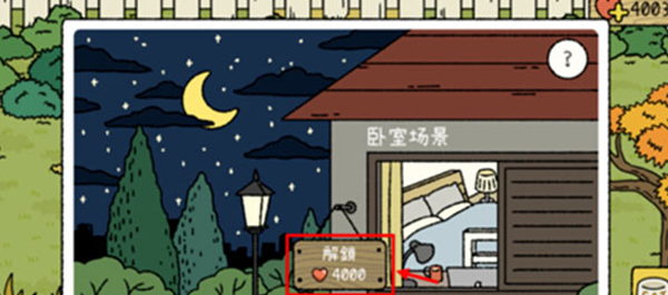 3、然后点击“卧室”选项,解锁卧室需要积攒4000爱心值就可以了。