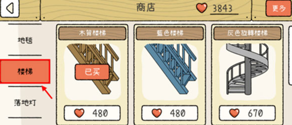 4、点击“商店”选项后选择“客厅用品”,再切换至“楼梯”选项,可选购楼梯。