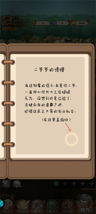 点击【二爷爷的馈赠】中的指纹区域,确认继承遗产,开启创业之旅,这是进入游戏的第一步。