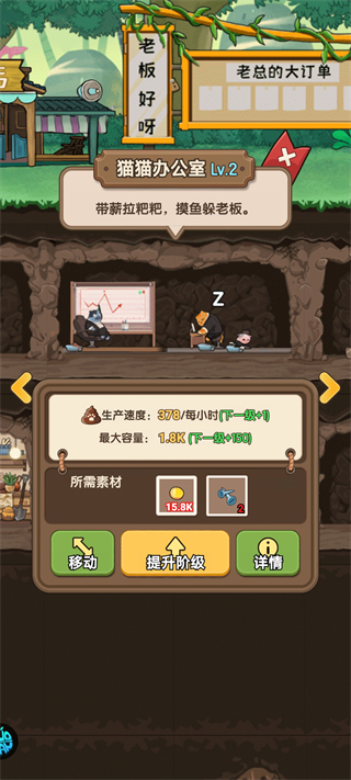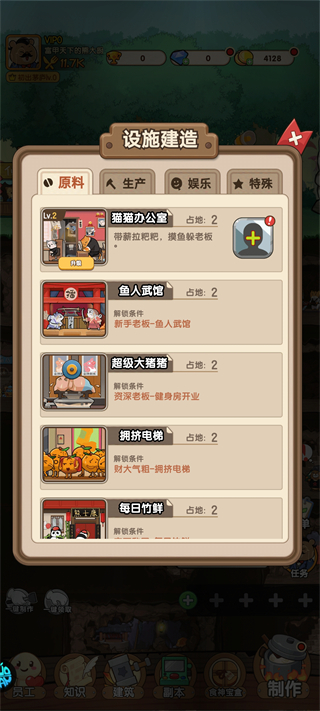 在【建筑】界面解锁【猫猫办公室】等设施,满足占地与解锁条件后建造,设施可自动生产资源,逐步扩张产业规模。