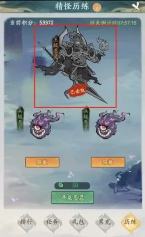 精怪历练中会随机刷新兵级、将级和王级恶灵,玩家通过消耗驱灵符来驱散恶灵从而获得道具奖励和积分。这个活动主要有三点: