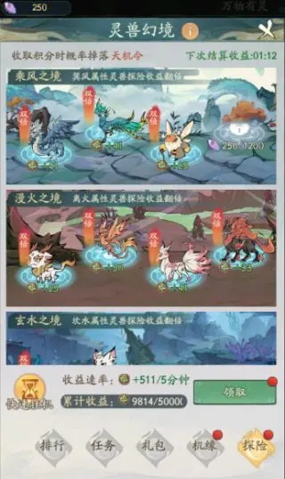 派遣灵兽到幻境中可以持续获得积分并且有概率获得天机令,天机令可以在机缘中抽取奖励,玩家可以存20只灵兽备用,放置相应属性的灵兽可以获得双倍积分收益,灵兽的品质越高获得的积分也越多,然后根据积分排行在结算时获取相应的奖励。