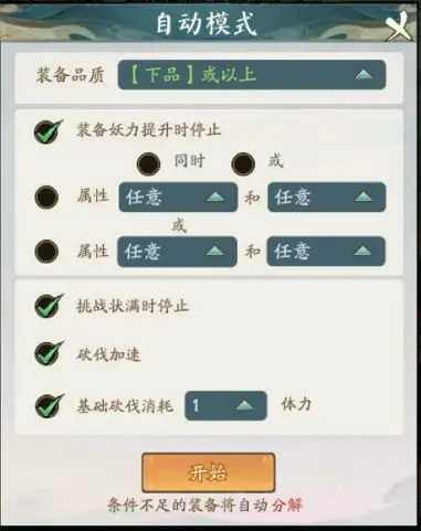 第一天主要就解锁这些玩法,炼气后期我们会解锁自动砍树,如果开了月卡的话还会解锁加速砍树,建议按下图设置,这样就可以一边挂机砍树一边去做别的任务。