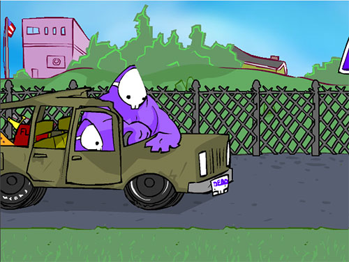1、在游戏的开始便是大力士开着车带儿子来幼儿园;