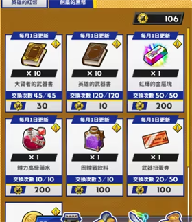 建议将黑币全部用于兑换sr书、r书、红药、紫药以及武器券。