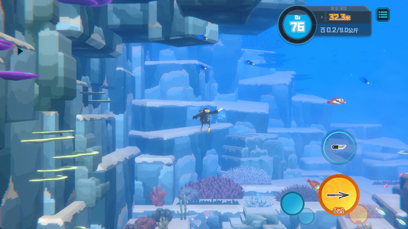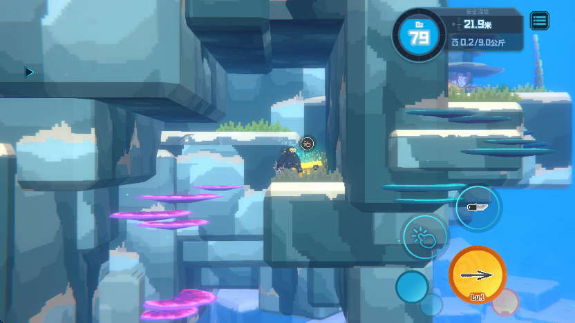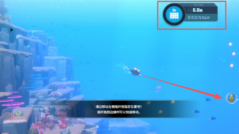 3、随后按照指引,前往标记出,玩家需要实时注意屏幕右上角的“氧气含量”,“深度”以及携带“重量”,随着深度的增加,耗氧也会增加。