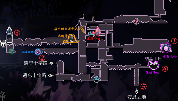 拿到水晶之心(超级冲刺)后先别急着走,因为水晶山峰没有鹿角站跑图比较麻烦,最好重要道具一次拿完。拿到水晶之心和店主的钥匙后后如下图序号走。