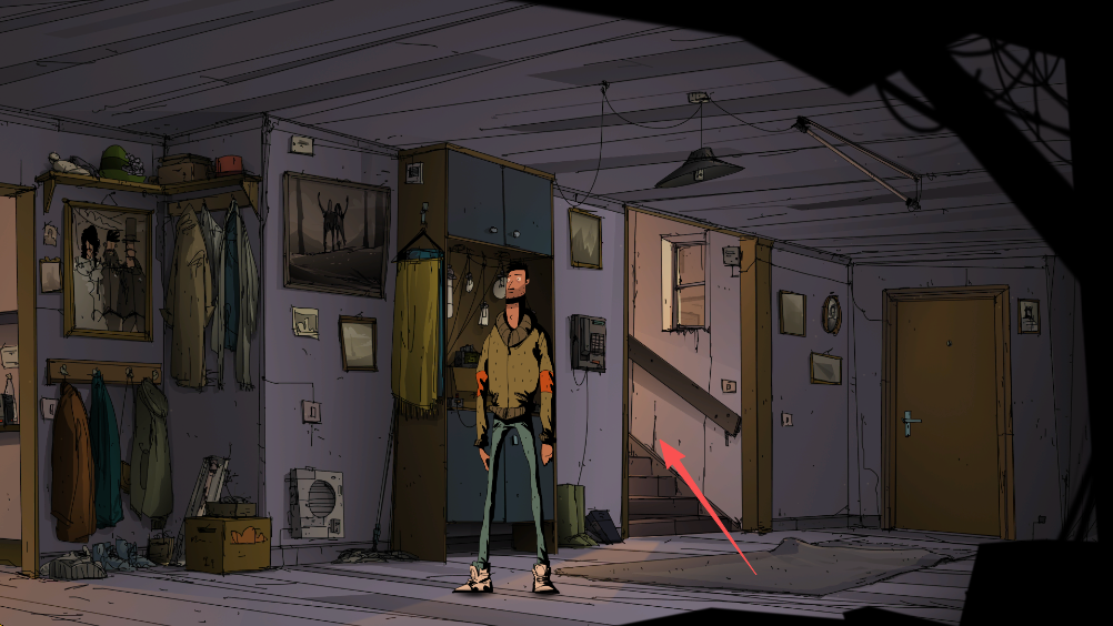 2、玩家主要通过点击来控制角色的移动,点击“楼梯”既可以上楼了,一个小技巧,双击切换场景的关键部分,比如大门,楼梯等等,无需等角色移动过去,可以直接进入该场景。