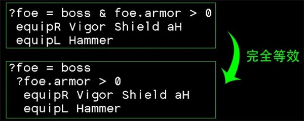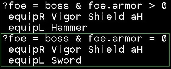 上图的这段表示,当目标为boss,且目标护甲大于0时,右手装备盾,左手装备锤子。