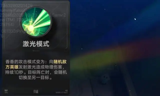 效果:向随机敌方英雄发射激光造成物理伤害,持续10秒。目标阵亡时,会随机切换至另一目标。