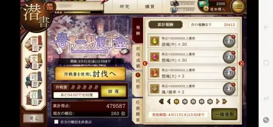 点击活动有碍书,即可进入此界面,消耗作战书可进入活动有碍书进行潜书,根据伤害获得点数。活动内有四位文豪以及限定属性可以提供额外的点数加成,可通过任务概要查看。