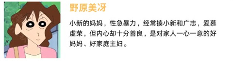 7、野原美冴:小新的妈妈。性格急躁,还带有暴力倾向,经常对小新和广志动手。有些爱慕虚荣,但她内心其实很善良,是一个全心全意关爱家人的好妈妈、好主妇。