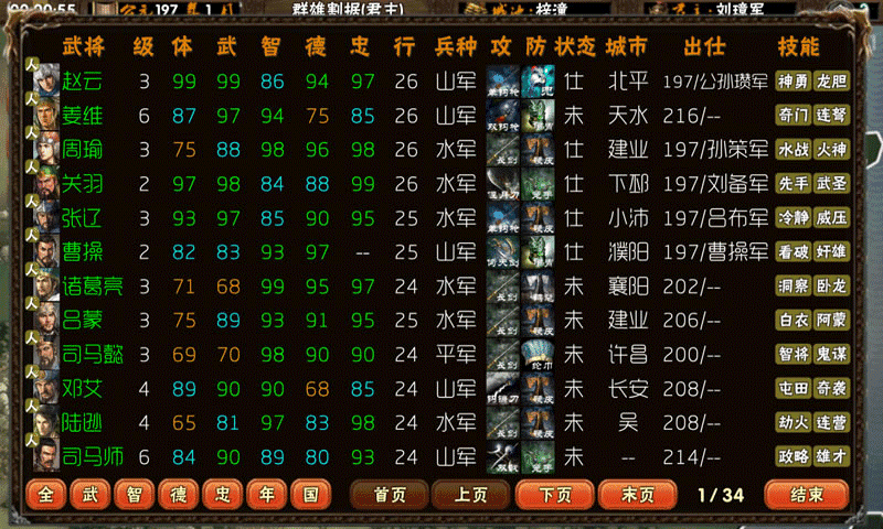 ↣开局以后:进入游戏画面,点击城池使用搜索功能(注意用排名第一的武将,搜到东西更好),基本上一次或两次可以搜到新武将,一个城池基本上只有一个,但是隔一段时间(楼主也不知道是多久)会刷新,有叠加效果,就是隔了很久去搜索可以连续搜到武将,征用并征兵补充,注意使用奖赏功能提高忠诚度,否则可能会发生自立、叛变等等