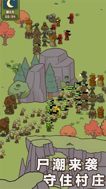 硬扛进阶尸潮不止普通僵尸!变异狗熊、巨型毒瘤巨人Boss等新威胁将冲击村庄 —— 用路障分层、炮塔集火、陷阱拦截,结合地形构筑 “死亡防线”,每一波尸潮都是策略与资源的双重考验。