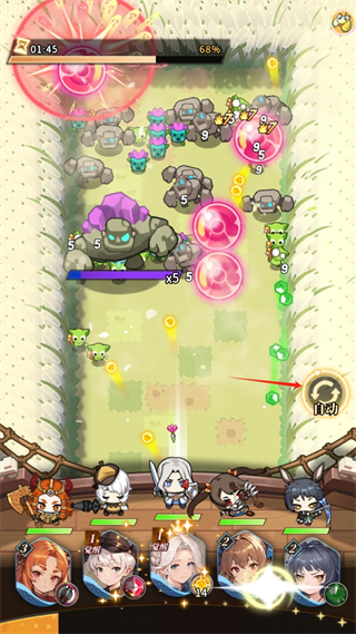 你将指挥5个伙伴,利用发射弹球攻击敌人。游戏中的弹球类型多样,包括反弹球、穿透球和大型球,每种弹球都具有独特的攻击特性和战术价值。