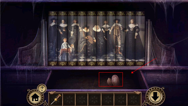 5、回到大厅往前走,是【过道】。点击右边的书架后发现少一本书。将刚才获得的书放进去,然后调整书的顺序使上面的画拼接完整。搞定后获得一个抽屉把手。退出书架视角,调查地上的红色垫子,挪开后提示木板下面有东西,但是还打不开。过道左边还有扇门,暂时还打不开。