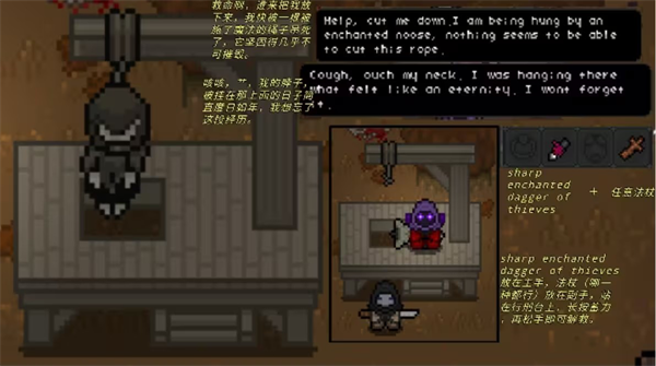 图中第一条对话框得知需要解救人物下来。随即找到如图的两样道具进行解决,然后有第二条对话框。人物就解锁了。