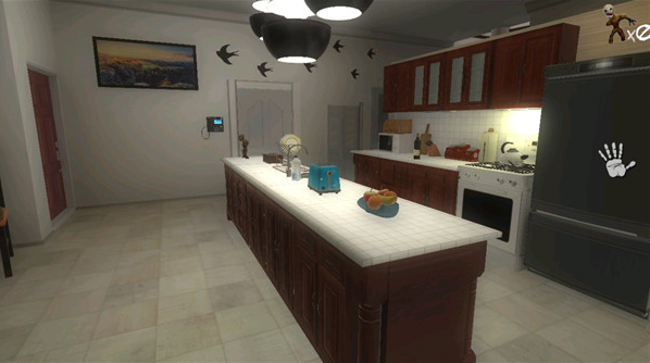 接着,继续向前走,走进厨房,别管墙上的字,(因为我看不懂英语)靠近桌子时,会看见一坨类似男人的不明黑影高举一把菜刀,似乎准备砍一个女人(她也是黑影)画面结束,右手边有一处一直在滴血的地方,如果你以75度过度忧郁的视角看天花板,会发现一个形似卫生间漏水口一样的东西(不能调查)。