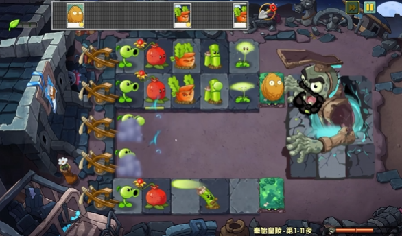 BOSS战机制:最终关卡需对抗融合秦始皇元素的巨型僵尸BOSS。BOSS会释放火球、冰霜等技能,玩家需根据其行动规律(如蓄力阶段)预判技能释放,并通过种植冰菇或辣椒等克制植物进行应对。
