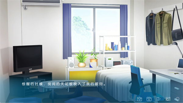 游戏以第一人称视角展现主角苏醒场景,通过文字叙事推进剧情,可点击界面按钮继续阅读后续故事。