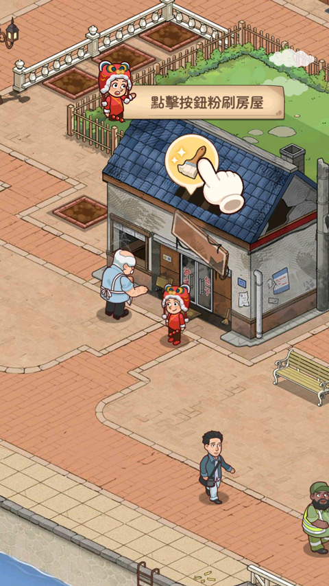 2、根据引导提示进行操作,首先需要点击按钮为小屋重新粉刷;