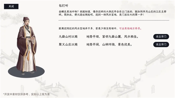 当少侠达成指定条件(江湖名望+基础材料+金币)后,可找【包打听】选择心仪地图设立宗门,地图上其他江湖势力也会显现,少侠可通过招募高手、派遣弟子外出历练完成宗门事务获取资源,自由发展势力。