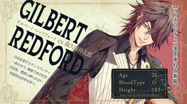 3、吉尔伯特・烈福(Gilbert・Redford)【CV 森久保祥太郎】:三个黑手党组织达成共识后,布鲁罗纳迎来和平;如今维斯康蒂专注于生意,尤其在禁酒令下与芝加哥黑手党交易。