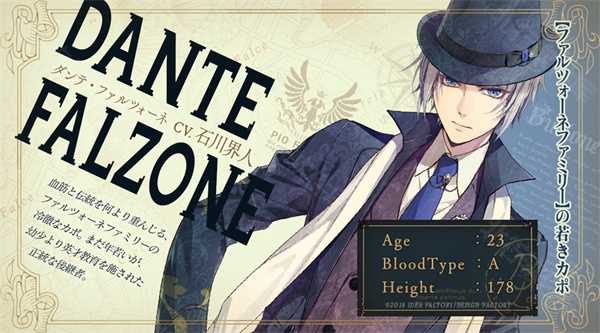 2、但丁・法尔宗(Dante・Falzone)【CV 石川界人】:消灭 “老鼠” 后被黑手党排斥,重返布鲁罗纳的动荡局势,与维斯康蒂合作,推进对动荡区域的掌控。