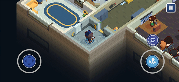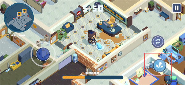 1、进入狼人清洁工汉化版游戏后,角色通过屏幕左下方的虚拟摇杆进行移动,右侧则是执行清洁操作的功能按钮。
