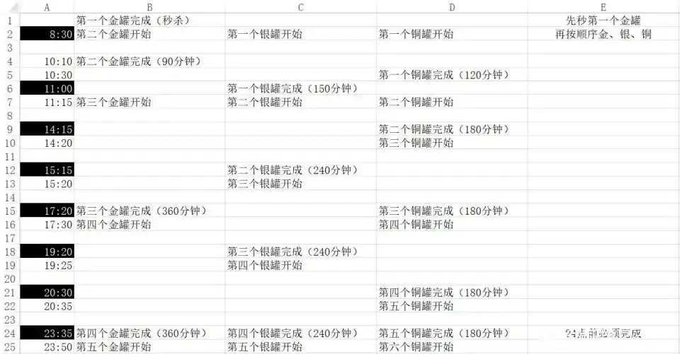 这是收罐攻略图,来自贴吧用户#810249134#的收罐时间安排攻略。早八到晚十一最大限度收罐,需要上线八次,属实是小肝,但收益非常高。