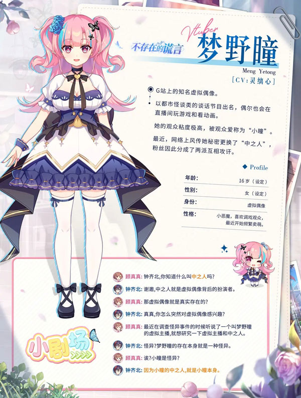 剧情交互与选择:通过对话选项推动剧情发展,关键选择影响角色好感度与故事走向(如是否信任苏半夏、如何调查梦野瞳事件);内置“手机系统”,可接收角色信息、浏览虚拟偶像直播记录,获取线索碎片。