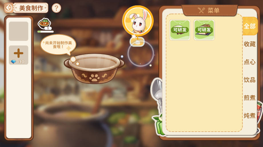 4、通过美食系统,玩家可以使用各种各样的食材对美食进行研发和制作。美食可以增加精灵们的好感度,并为他们恢复能量。
