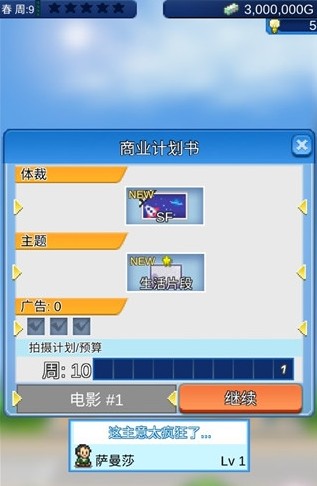 4、选择完成后,需要拟写商业计划书,即电影的题材、主题、广告等,好的题材往往能带来不错的热度;