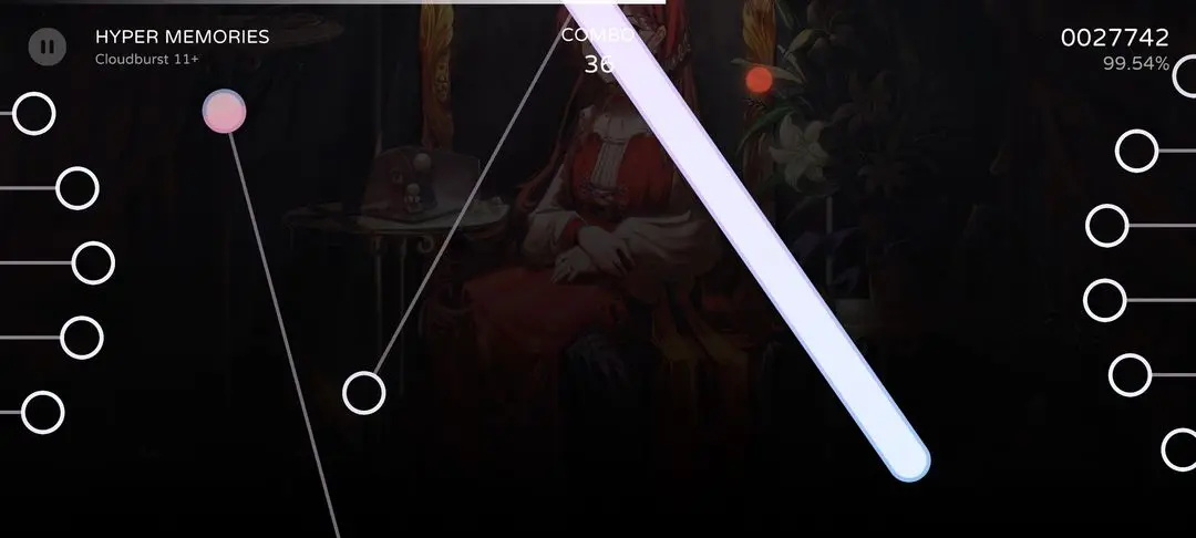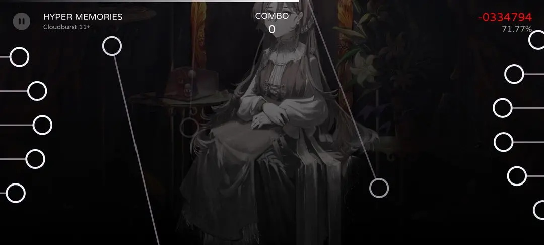 4.当分数变为红色且分数变为负数时,击打剩余的note增加分数使分数变为整数,成功后进入隐藏曲。