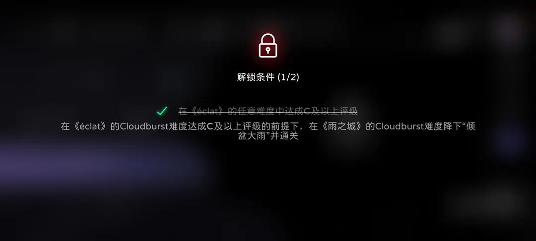 主线章节部分乐曲需要通过特殊方式解锁,点击上锁的曲绘可以查看解锁条件,已达成的条件会被划去。